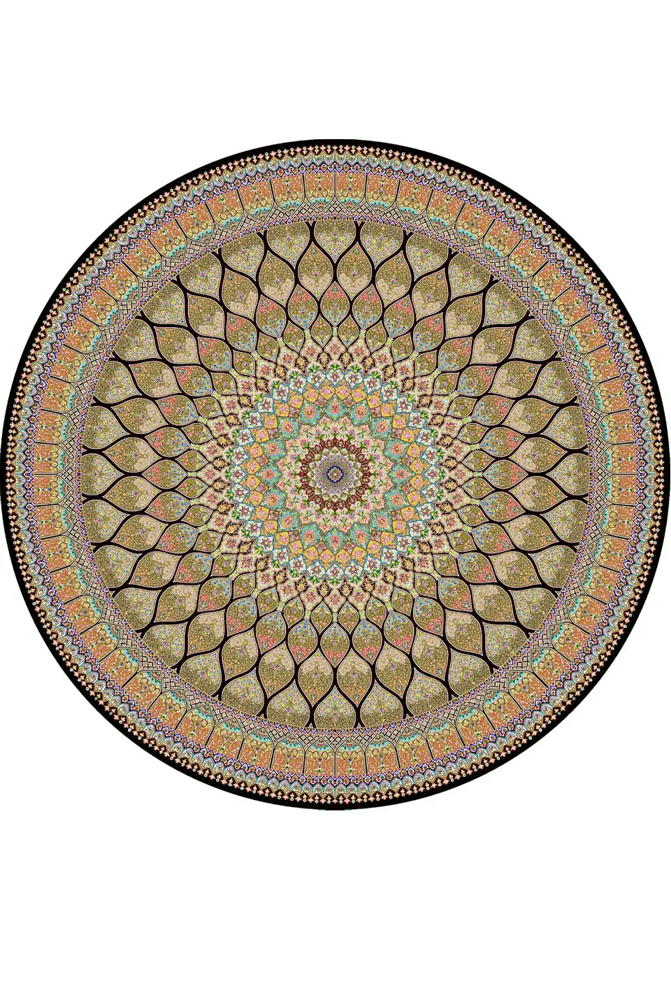 الیاف به‌کاررفته در این فرش از ابریشم مرغوب برای نخ خاب و نخ تار و پنبه طبیعی برای نخ پود انتخاب شده‌اند؛ ترکیبی که نه‌تنها ظرافت و درخشندگی خاصی به بافت می‌بخشد، بلکه دوام و ماندگاری بالایی را نیز تضمین می‌کند. با ۲,۴۰۰,۰۰۰ گره در هر متر مربع، این فرش جزئیاتی خیره‌کننده و وضوحی مشابه نمونه‌های دستبافت ارائه می‌دهد. ارتفاع نخ خاب این فرش ۵ ± ۱ میلی‌متر است که تعادلی عالی میان نرمی زیر پا و استحکام بافت برقرار می‌کند. این مدل با قطر 1، 1.5 و 2 متر و با شانه ۱۶۰۰ و تراکم ۴۵۰۰، انتخابی ایده‌آل برای فضاهایی است که به دنبال یک نقطه کانونی لوکس و باشکوه هستند. قابلیت شستشو و گارانتی اصالت و سلامت کالا، این اثر هنری را به سرمایه‌گذاری مطمئن و ماندگار برای خانه شما بدل می‌سازد.