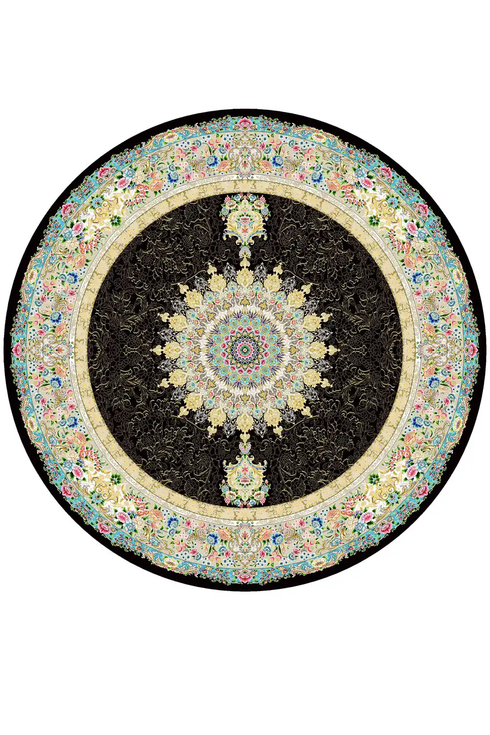 فرش گرد ابریشم ماشینی طرح اصفهان مشکی