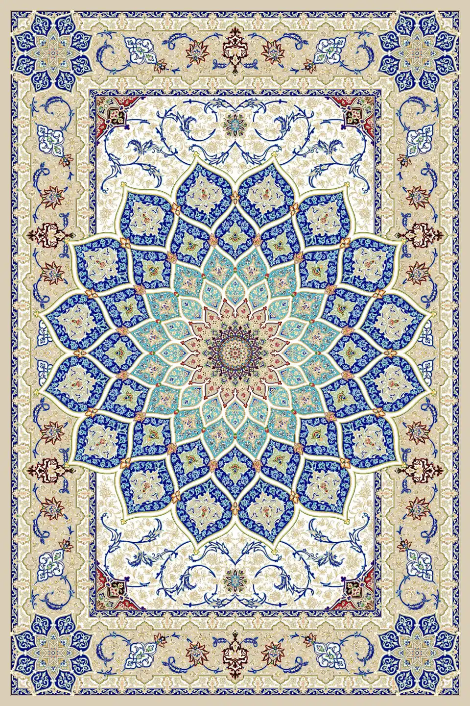 فرش ابریشم ماشینی طرح گنبد اصفهان 1600 شانه با زمینه کرم، جلوه‌ای باشکوه از هنر معماری ایرانی را به تصویر می‌کشد. ترنج مرکزی آن با الهام از نمای گنبد از زاویه پایین، شکوهی گنبدوار دارد که تا حاشیه‌ها امتداد یافته و چهار گوشه فرش نیز با ترنج‌های کوچک‌تر آراسته شده‌اند. زمینه با نقوش اسلیمی لطیف و منظم پوشیده شده که حس تعادل و تقارن را القا می‌کند. این فرش ماشینی نفیس، تلفیقی از ظرافت ابریشم، دقت طراحی و اصالت نقوش اصفهان است.